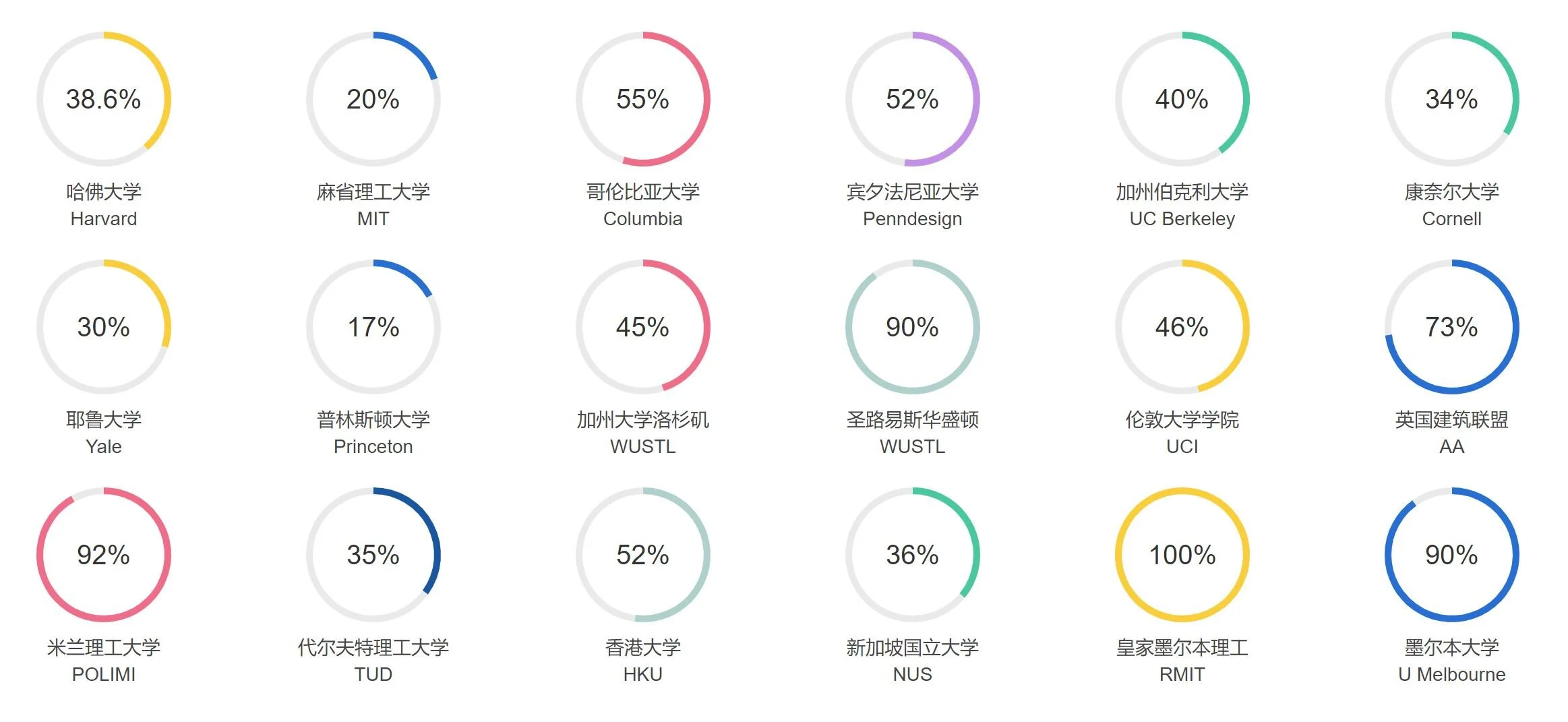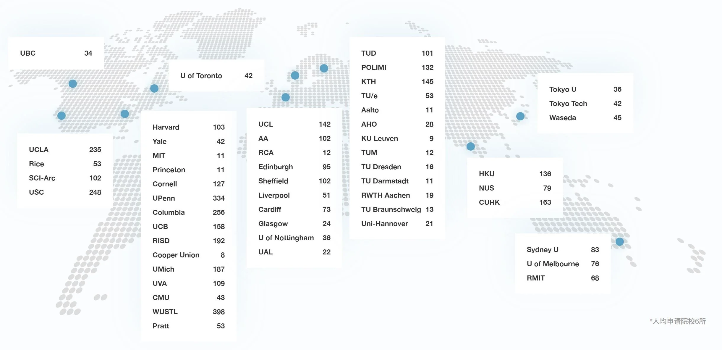 This is the admission statistics from another major portfolio agency. They chose to show the cumulative number of students over the years on their homepage who received offers, as opposed to the annual offer results as seen from the previous agency (students usually get multiple offers, but only enter one school). For top-ranking schools like Harvard, they have a total of 103 alumni admitted, not to mention schools that are easier to get into, like UPenn and GSAPP, where they have 200-300 alumni.
