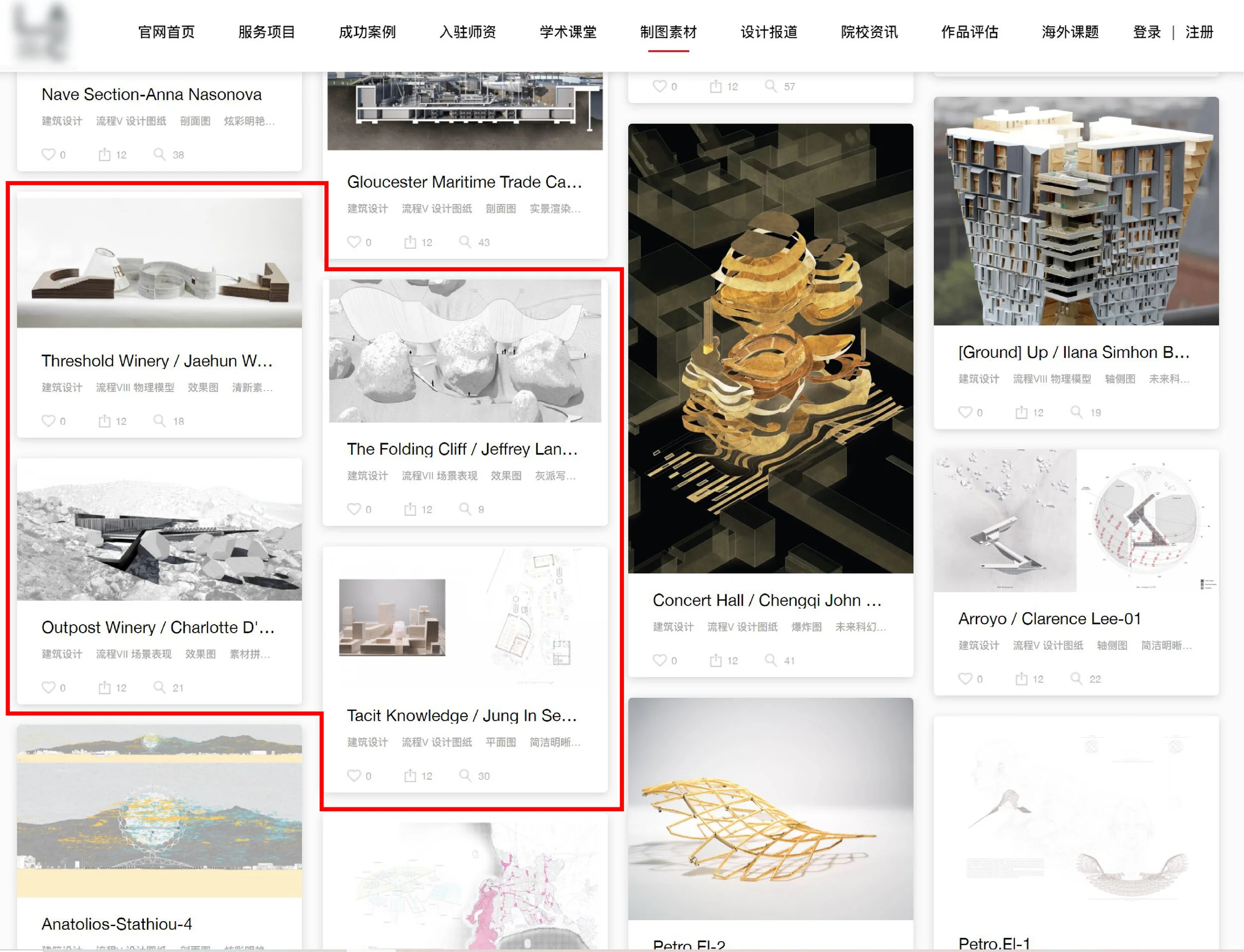 This portfolio agency collected a lot of drawings and models from the internet (basically building their own Pinterest), and displayed them on their website, in the section called “materials for drawings”. Not surprisingly, I found my classmates' drawings at MIT as well. Collecting references for architecture students is a very common behavior, but it starts to feel complicated to see your own work or the work of people around you being taken by others to earn money.