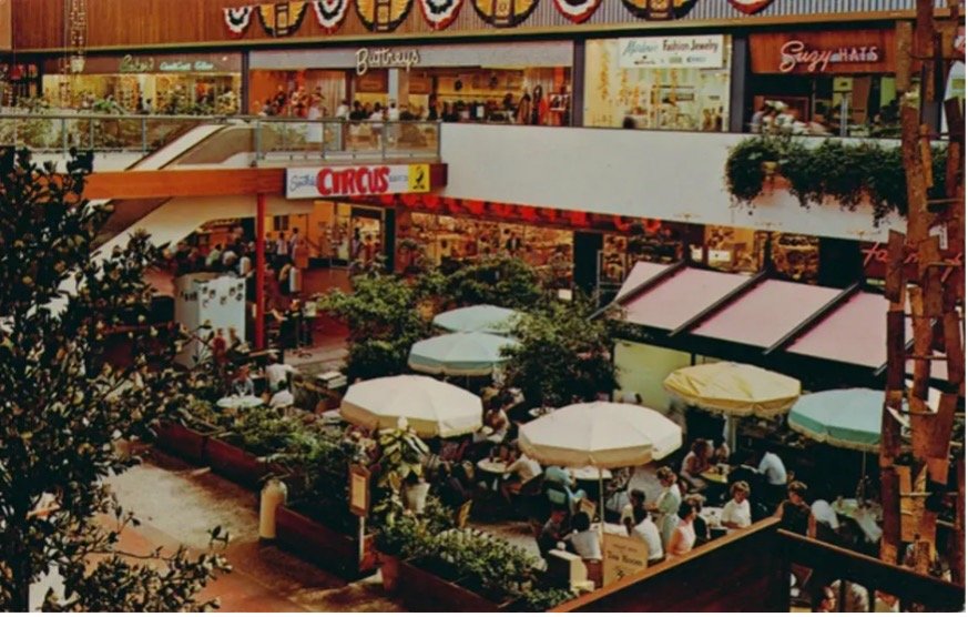 In 1956, Southdale Center, America’s first fully enclosed shopping center, opened in Edina, Minnesota. Southdale was the architect Victor Gruen’s experiment: a simulation of the old European city transplanted into burgeoning suburban sprawl of America. Two major department stores on the opposite end were connected through an axis of atrium with a central garden at the midpoint. This enclosed space allowed a creation of a new biome - a synthetic paradise of hanging plants draped from balconies, fishponds, towering artificial trees, and a 21-foot cage teeming with birds.[1] The enclosure offered a refuge from Minnesota’s extremes, allowing visitors to forget the suffocating humidity of summer and the biting -30°C cold of winter. With Sidewalk Cafe, a restaurant with umbrellas over the tables that spilled over to the atrium, and sitting areas around the central garden, pieces of the Gruen’s old world across the Atlantic ocean travelled to American Midwest.