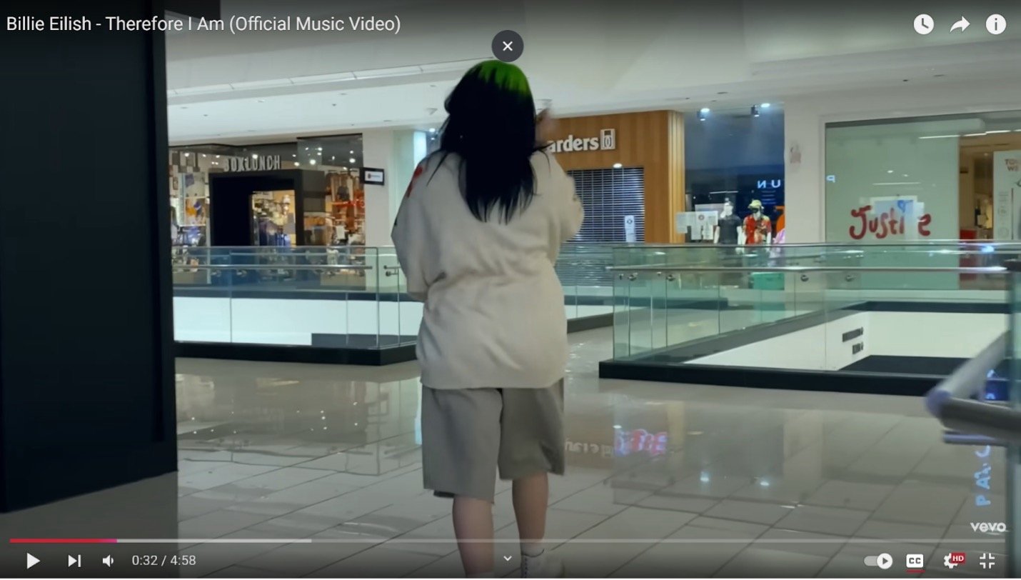 Billie Eilish’s Therefore I Am music video[1] starts with the zoomed in shot of Billie’s feet on glossy tiles. The shaky handheld camera follows Billies’ footsteps as she hops onto an escalator. The setting remains unspecific, cloaked in the anonymity of a sterile white tunnel. Yet, as Billie rounds the corner, the glow of a PacSun logo flickers into view. The whimsical typography of Justice, the glistening white floors, and the cool translucency of bluish guard rails evoke a space so ubiquitous it verges on the uncanny: the shopping mall.