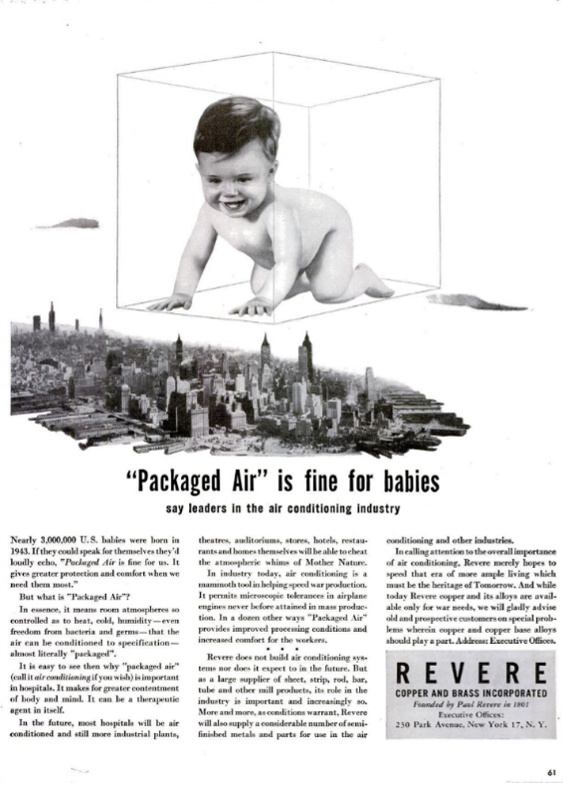 Carrier’s mechanization of human’s state of comfort was first implemented in 1906 through summer operation of theaters at Madison Square Garden. With no windows and heat generated by tightly packed bodies and light sources, the theater was a space that was impossible to inhabit in the summer. The previous attempts of cooling the space through tons of ice failed by the polluted lake water generating malodors. Using the uninhabitable space as a testing ground, Carrier’s new human comfort generating machine generated a spectacle with a large audience inhabiting previously avoided time and space. The conceptual infinity of coolness trickled down from the large spaces that sold coolness as a commodity from the 1930s to the everyday necessity. By the 1940s, the “luxury” became utility. The 1944 copy of Life Magazine celebrated the technological feat to “cheat the atmospheric whims of Mother Nature to its readership.[3] The Story of Manufactured Weather, by the Mechanical Weather Man, published by Carrier Engineering Corporation, Carrier promised “Everyday a Good Day,” on the footnote of every page.