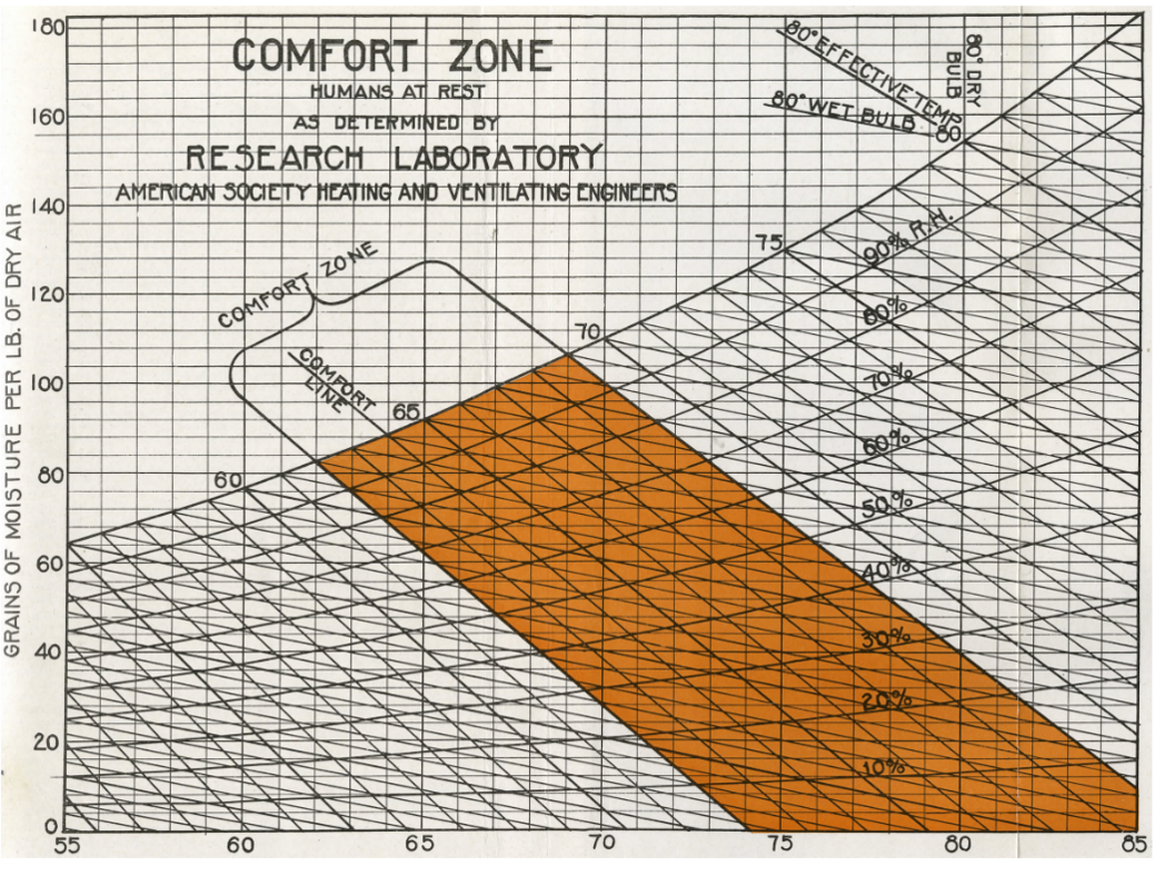 The transformation of Carrier’s technological invention of air conditioning adopted aspects of cultural inventions with an extra patent on the Psychrometric chart became the basis of climatic regulations for manufacturing comfort. The two axes of the chart conflated air conditioning with comfort and created a new definition of comfort. Any individual could define their current state on the chart from any point on the earth, and with the aid of mechanical systems, they could achieve comfort. The psychrometric chart led to developments in thermal comfort research and “graphic dissemination” throughout the 20th century. In 1963, Victor Olgyay published a book, Design with Climate that covered representative climate scenarios around the United States and included charts that used the psychrometric axes as a basis. Oglay’s chart and Givoni’s bioclimatic chart in 1976 demonstrated how the uniform “comfort,” could be achieved in different regional climate conditions.